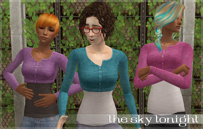 Cropped cardigans on a new mesh featuring pieces from Amaryll’s athleticwear and Aguilegia’s fixed HP top. I realized after I finished I should have mapped it in a way that allows bottoms to go beneath the sweater, but considering how many recolors there would be to fix… screw that.