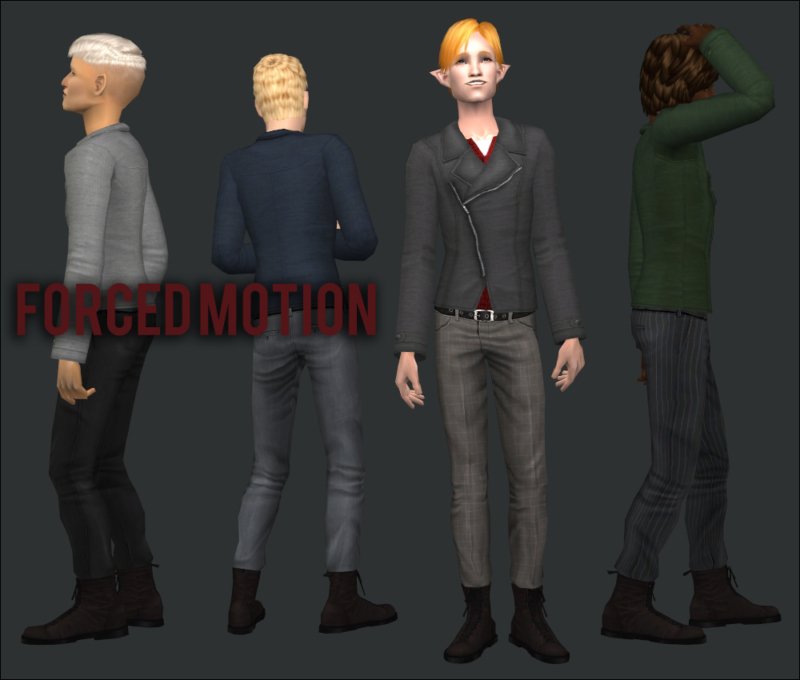 Skinny jeans tucked into Doc Martens (Ten Talents) plus Yuichen’s new diagonal-zipper jacket for adult males as everyday, formal and outerwear. Five different textures. All pants textures by Misomoso and jacket textures by Yuichen. Boots are brown on all textures and the mesh has all morphs.