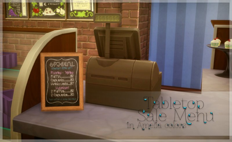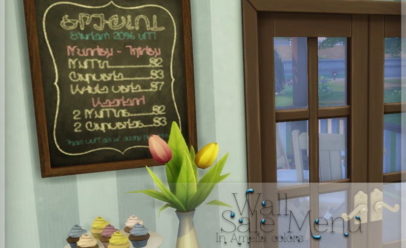 Framed chalkboard simlish menus in five colors, on both tabletop and wall base game meshes. Tabletop menu costs $10. Wall menu is $15.