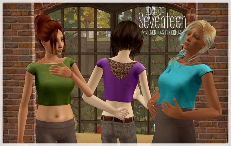 Sims2 counterparts of Edge of Seventeen, colorful crop tops with lace panels on the back for female adults. Comes in the original eight colors. Mdpthatsme’s mesh did not have morphs so I have added them.
