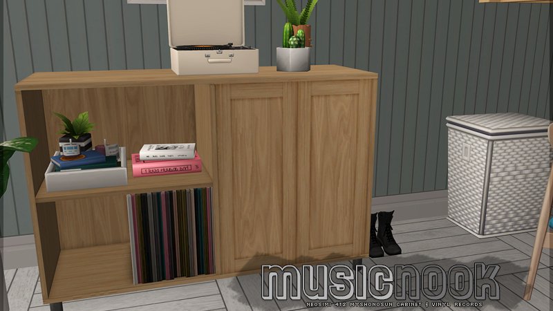 Myshunosun’s music nook storage unit with paneled doors in amelia and (most of) pooklet’s natural colors, as well as 14 vinyl recolors featuring Mammoth WVH, Silversun Pickups, Wet Leg, and more.