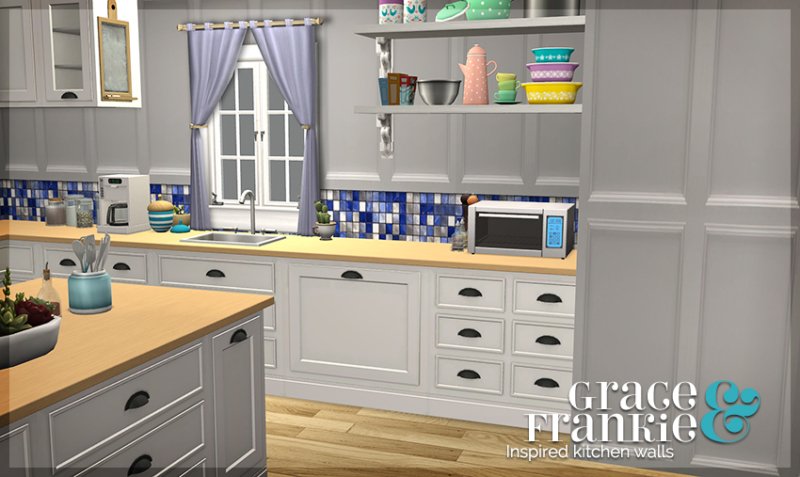 The Sims 2 version of the Grace and Frankie kitchen walls, inspired by the Netflix show. As shown, there are seven tile colors and a single full panel wall. They can all be found in the tile category for $3.